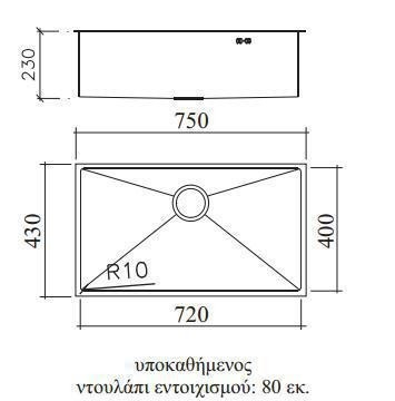 - Εσωτερικά στα τοιχώματα και στον πυθμένα της γούρνας υπάρχει μικρή καμπύλη R10 για ευκολότερο καθαρισμό