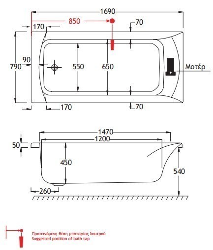 - Μπανιέρα Υδρομασάζ Carronite 170X80 που αποτελείται από :