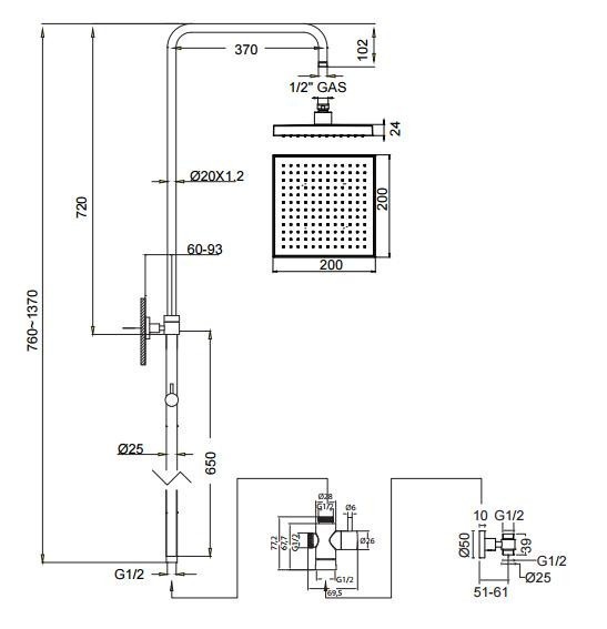- Κολώνα ντους με τετράγωνη, ανακλινόμενη κεφαλή ντους abs anticalcare 20x20cm χωρίς μπαταρία