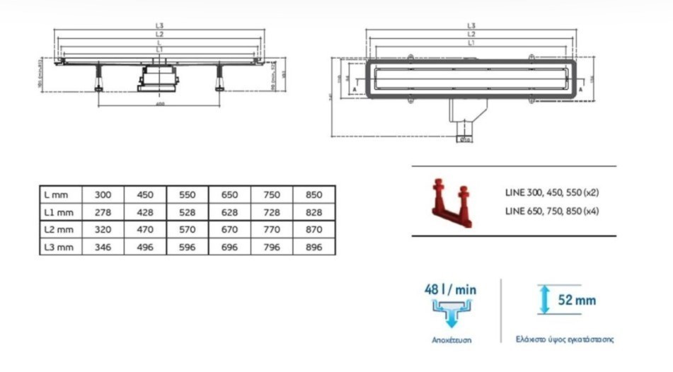 • Σιφώνι δαπέδου ευθύγραμμο, χαμηλού προφίλ που καταλαμβάνει τον ελάχιστο δυνατό χώρο κάτω από το δάπεδο