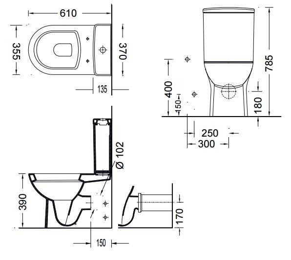 - Back to wall (δεν υπάρχει κενό ανάμεσα στον τοίχο και τη πορσελάνη της λεκάνης)