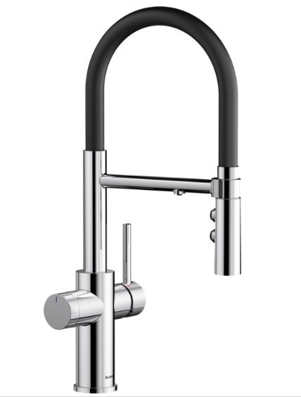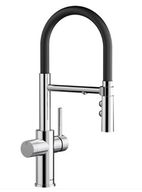 - Μπαταρία κουζίνας χρωμέ γυαλιστερό/με μαύρο εύκαμπτο σωλήνα από σιλικόνη,με 2 εξόδους νερού (1 έξοδο για φιλτραρισμένο νερό και 1 έξοδο για μίξη κρύου και ζεστού νερού με ντους 2 ροών-απλή ροή ή ψεκασμό)