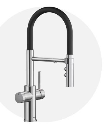 - Μπαταρία κουζίνας PVD STEEL (ματ χρωμέ) /με μαύρο εύκαμπτο σωλήνα από σιλικόνη,με 2 εξόδους νερού (1 έξοδο για φιλτραρισμένο νερό και 1 έξοδο για μίξη κρύου και ζεστού νερού με ντους 2 ροών-απλή ροή ή ψεκασμό)